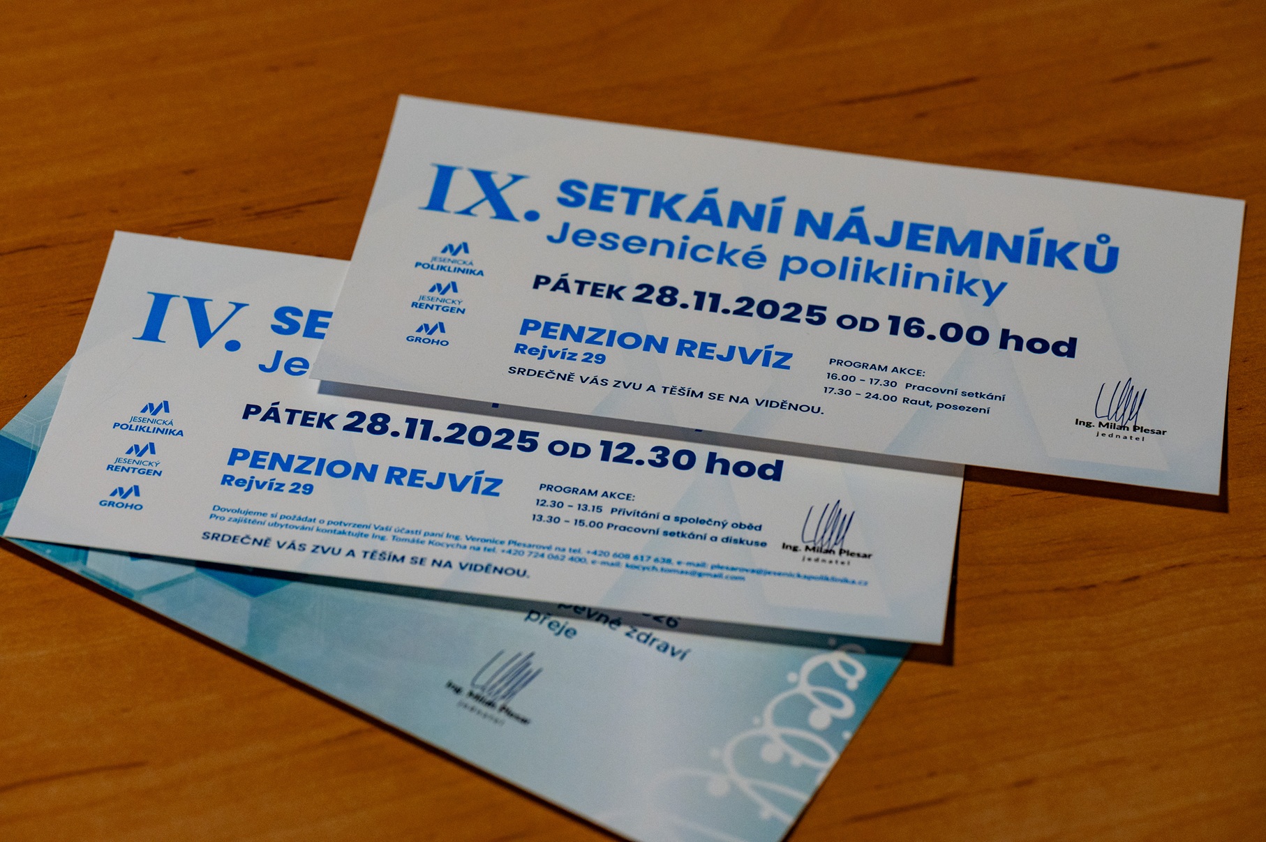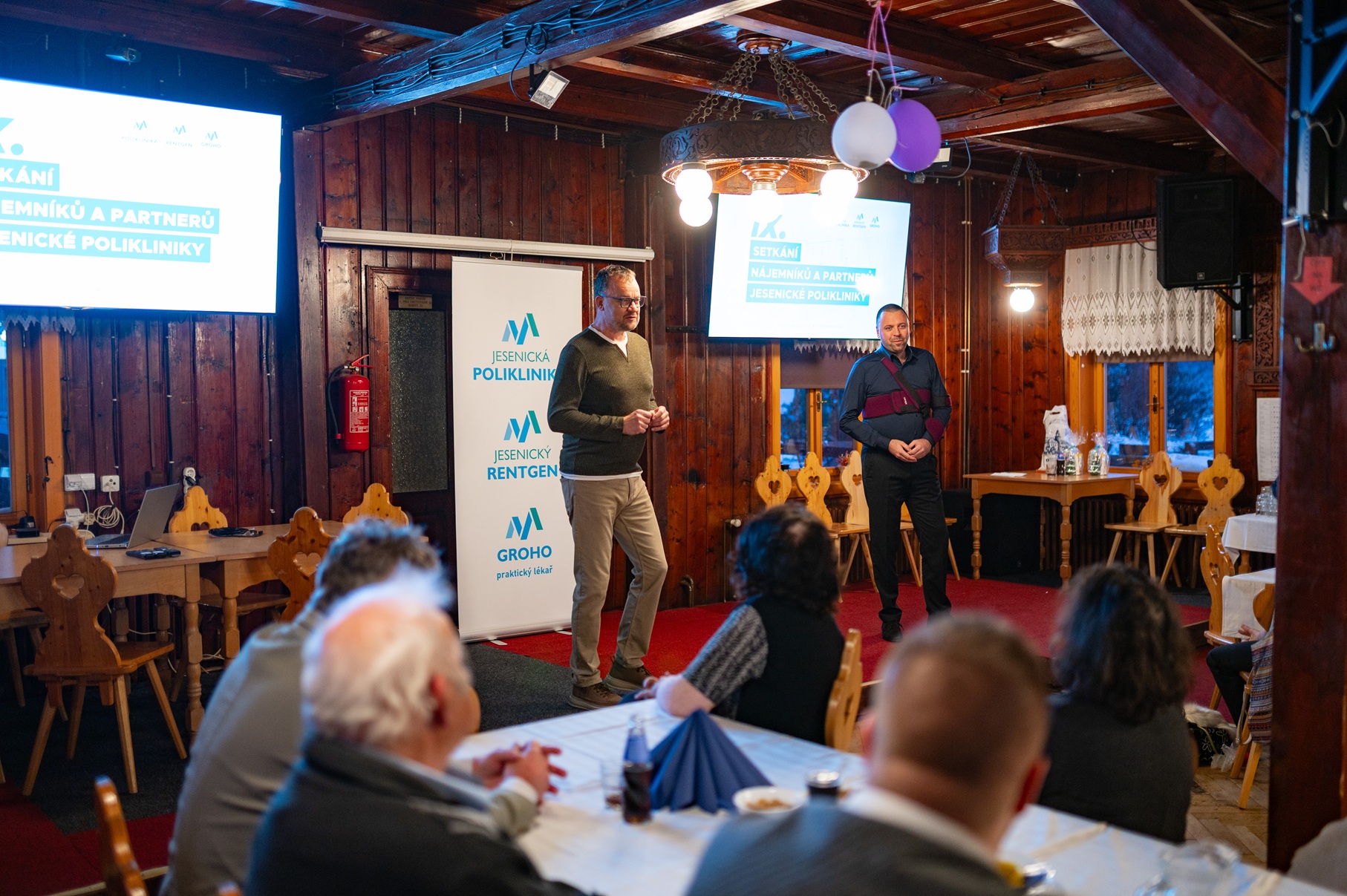 (4. 12. 2025) Koncem listopadu se na pozvání majitele konalo tradiční, v pořadí již deváté, pracovní a společenské setkání nájemníků a partnerů jesenické polikliniky, kterému předcházel společný oběd zaměstnanců a spolupracovníků Jesenické polikliniky, Jesenického rentgenu a ordinací praktického lékaře GROHO.