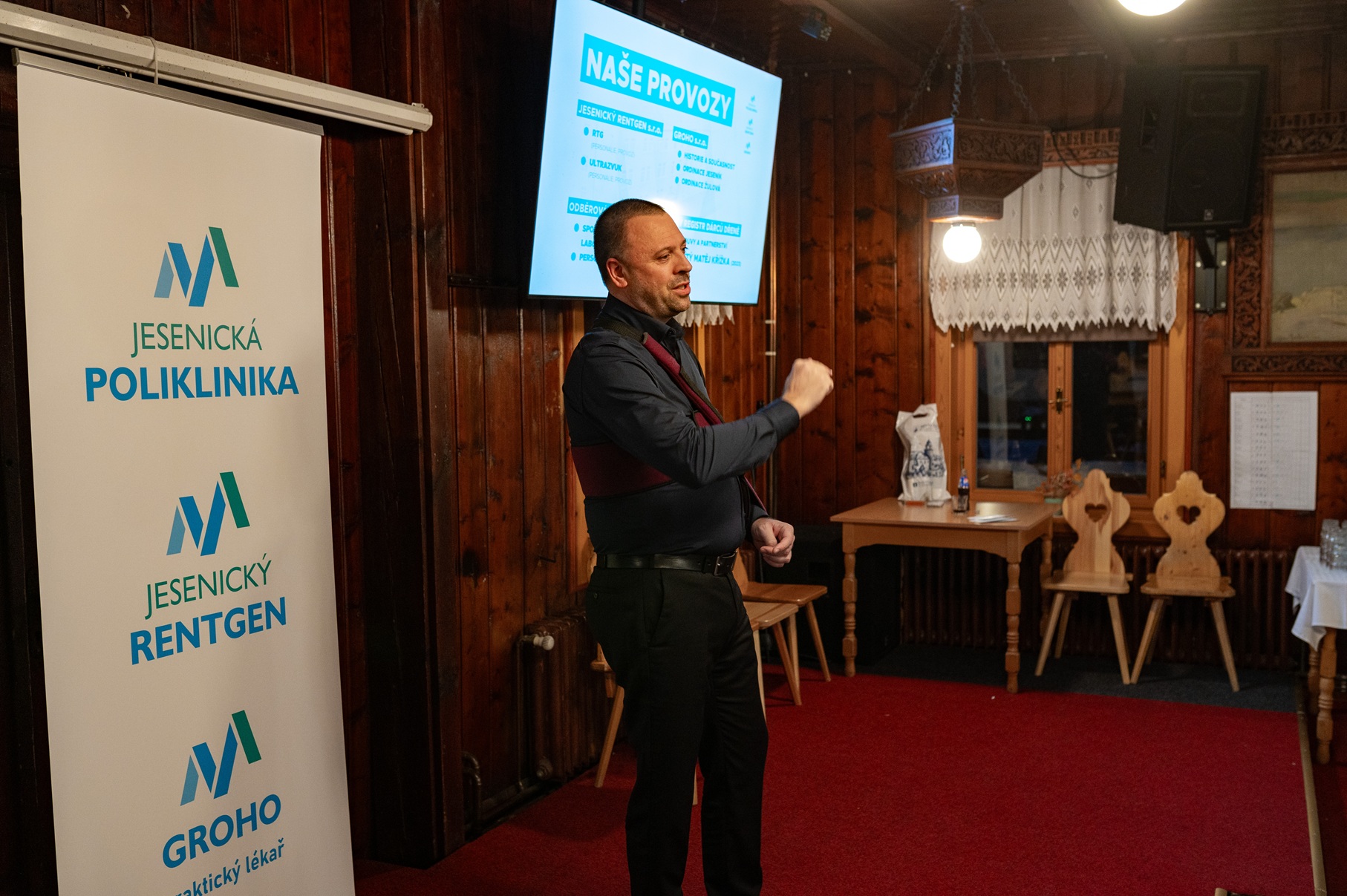 V netradičním, o to zajímavějším, prostředí Penzionu Rejvíz byly téměř pěti desítkám účastníků představeny provedené opravy a modernizace objektu jesenické polikliniky, především výtahu, které byly realizovány v roce 2025. Přítomní byli také seznámeni s činností společností Jesenický rentgen s.r.o. a GROHO s.r.o., která provozuje ordinaci praktického lékaře v objektu jesenické polikliniky a nově i v Žulové. Akce se zúčastnil starosta obce Radek Trsťan, který jménem svých občanů poděkoval za spolupráci.