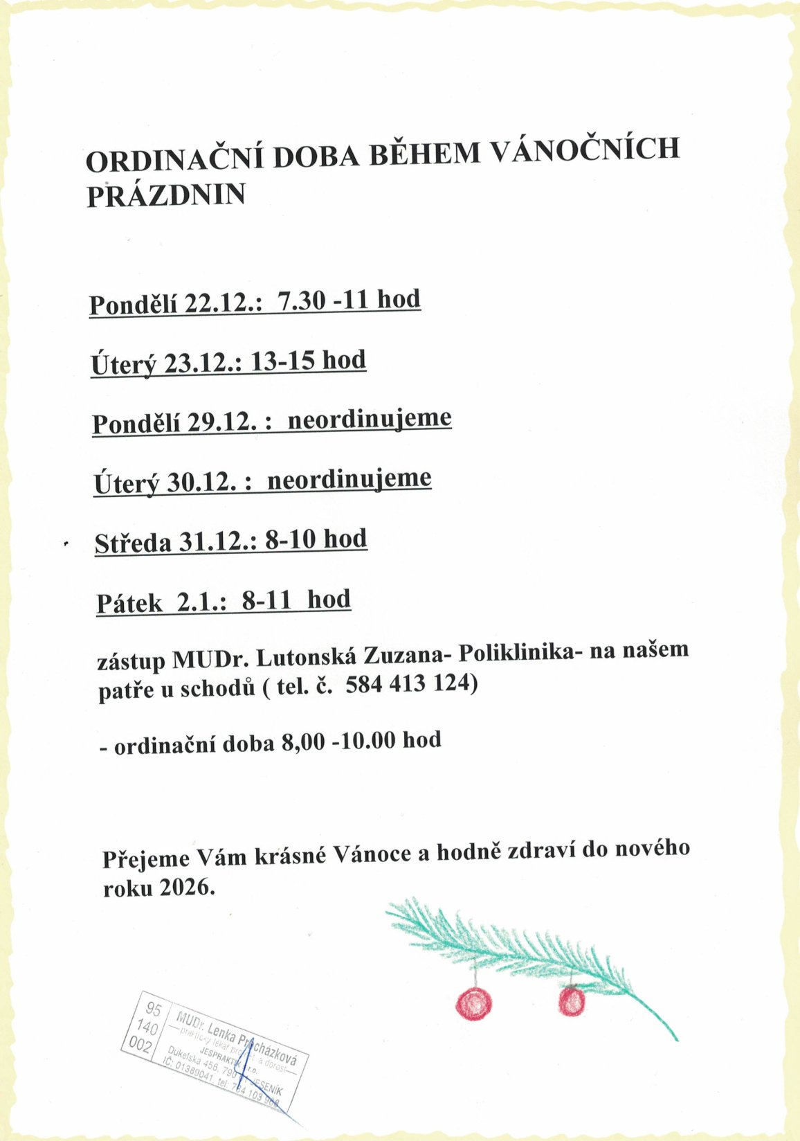 Ordinační doba od 22. 12. 2025 do 2. 1. 2026 níže v sekci Aktuality.