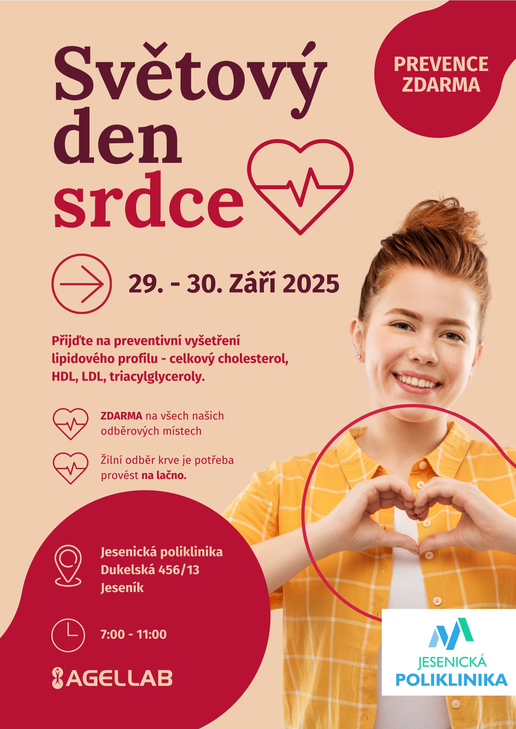 Ve dnech 29. a 30. září, vždy od 7.00 do 11.00 hod., se biochemická laboratoř AGELLAB v jesenické poliklinice připojí ke Světovému dni srdce. Zdarma nabídne preventivní vyšetření lipidového profilu – celkový cholesterol, HDL, LDL, triacylglyceroly.